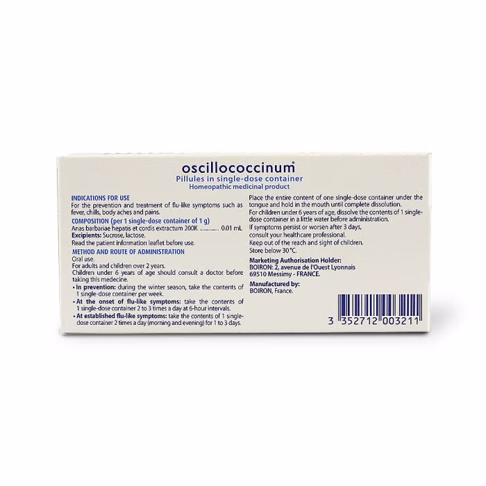 Oscillococcinum® comes in single-dose tubes of small sugar pellets designed to dissolve under the tongue. It is intended to be taken at the first signs of flu-like illness to help relieve symptoms and reduce their duration. The medicine is suitable for adults and children from 2 years of age, with medical advice recommended for younger children. It’s convenient format of 6 pre-measured doses allows easy and accurate use during a short course of illness.